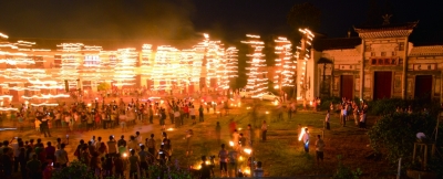 我的故乡江西宁都县洛口镇,保留着多个民俗活动,其中南岭竹篙火龙最为长久,也最为壮观。每逢中秋来临,总能看见一队队儿童,手持绑着一簇簇稻草结儿、插满香火的木杖敲锣打鼓地穿村入户,说一些吉祥话,讨一点好吃的,欢天喜地满载而归。入夜,各房火龙从不同方向云集卢氏大宗祠前的坪院里,以拈阄为序,依次点燃火龙。每根火龙由一两名青年后生高高举起,直插云天。霎时,天空照得亮如白昼。队伍在游走,竹篙在穿插,人群在喧哗,火龙在腾飞,明月在追随。