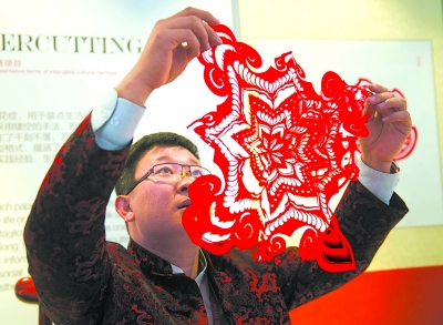 在国家会议中心,剪纸艺术家王磊审视自己刚完成的作品。