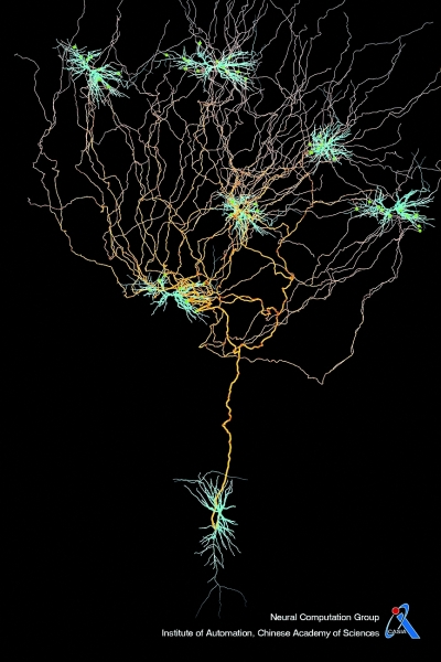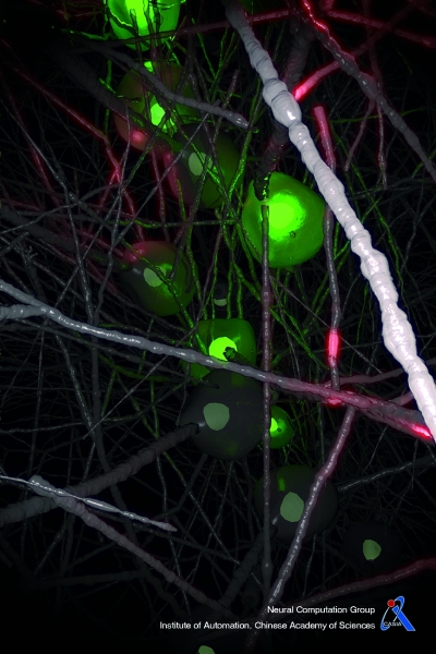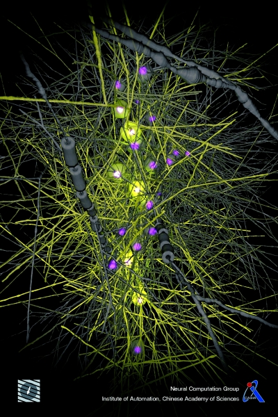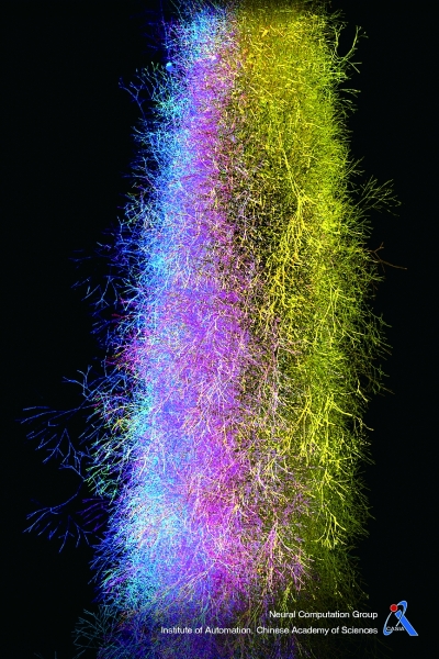 人类的大脑是如何处理信息的?这是脑科学研究者和人工智能科学研究者探索的科学问题。随着脑与认知科学的研究与发展,人们已经可以在微观水平观测到脑神经元的结构、不同脑区的形态,以及神经元放电、不同神经元如何构成神经网络等信息处理过程。结合这些实验观察,智能科学及计算模拟已可以在计算机上部分模拟脑信息处理过程。这些由中国科学院自动化研究所类人脑工程总体部绘制的图片是有关脑模拟和类脑计算的科研成果。对于科学家而言,这些图片显示的是微观神经元、神经微环路……但仅从欣赏的角度看,这些图片却也是一幅幅绚丽的“美术作品”。