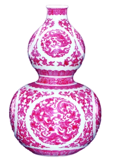 此瓶呈葫芦式样,外壁以釉里红作装饰,葫芦之上下腹纹饰构图相同,均以团龙纹作为主题纹饰,分为四组,间以花卉纹相隔。外足底部中央书青花“大清乾隆年制”六字篆书款,章法规矩,严谨大气。釉面肥润,釉里红发色典雅,纹饰笔触纤细,堪称乾隆时釉里红品种的经典之作,殊为难得。此瓶以取其谐音“福禄”的葫芦瓶式样呈现,据档案记载,此类样式多用于祝寿,查阅目前已知资料,在北京故宫博物院随安室陈设着一对乾隆釉里红团龙纹葫芦瓶;北京市艺术博物馆也藏有一件相同的乾隆釉里红团龙纹葫芦瓶。近年拍卖场上曾出现过与此瓶造型一致、纹饰略有不同、同样以釉里红烧造的清乾隆釉里红穿枝螭龙图葫芦瓶,于2010年春在香港苏富比以4322万元港币成交,足见釉里红葫芦瓶之珍罕程度。