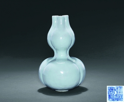 清乾隆仿官釉三连葫芦瓶,瓶身由三个葫芦重叠而成,连通一体,分别有三圆口,中腰紧收,酱褐色三连弧式圈足,底落“大清乾隆年制”六字三行青花篆书款。器型优美,线条婀娜,制作考究俊逸挺拔,静穆之中透出高贵典雅之气。通体施仿官釉,釉面莹洁温润,色泽淡恬幽靓,厚若堆脂,加之瓶体造型别致,隽雅端丽,古釉之美与当朝之器完美结合,相互映衬,相得益彰,达到了师古而不泥古的艺术追求。这两件瓷器将在中国嘉德2014年秋季拍卖会中予以呈现。