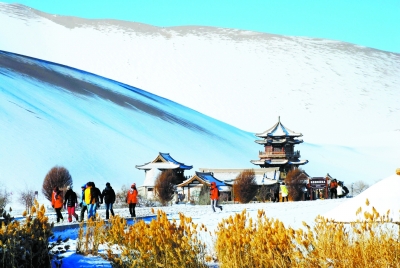 11月30日,游客在甘肃省敦煌市鸣沙山月牙泉景区参观游览。