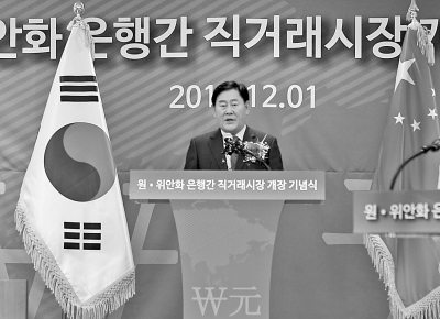 12月1日,在韩国首尔,韩国负责经济事务的副总理兼企划财政部长官崔炅焕在启动仪式上讲话。韩中银行间韩元对人民币直接交易当日上午9时在韩正式启动,这是韩国离岸人民币市场发展中具有标志性意义的事件,有助于降低货币兑换和交易成本。新华社发