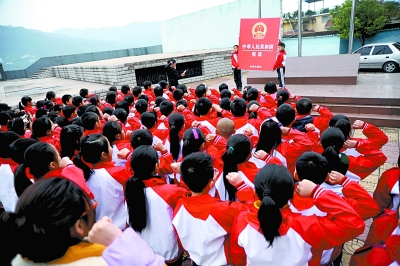 12月2日,重庆市云阳县人民法院举办“送法进校园”主题活动,法官们走进云阳教师进修学院附属小学,为孩子们送去书刊,组织学生们进行树立宪法信仰宣誓活动,以此迎接首个“国家宪法日”的到来。新华社发(饶国君摄)