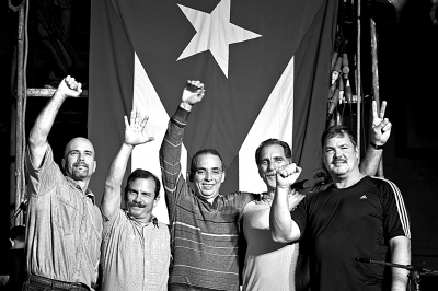 12月20日,在古巴哈瓦那,“古巴五人”:赫拉尔多·埃尔南德斯、费尔南多·冈萨雷斯、安东尼奥·格雷罗、雷涅·冈萨雷斯和拉蒙·拉瓦尼诺(由左至右)在古巴著名歌手西尔维奥·罗德里格斯演唱会上合影。“古巴五人”为古在美特工,其中两人刑满获释,剩余三人在被关押15年后,因古美两国元首宣布重启双边关系正常化被释放。罗德里格斯有“古巴的约翰·列侬”之称,他于1997年被评为联合国教科文组织和平艺术家。 新华社发
