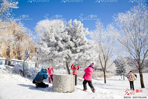 1月8日,吉林省吉林市松花江畔阿什段出现雾凇美景,喜迎天下客。当日,最低气温零下23℃,松花江畔再次出现雾凇美景,来自湖南、广东、香港等地的游客喜出望外,在雾凇下拍照留念。朱建伦摄/光明图片