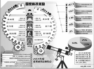 2014年度授奖国家自然科学奖46项、国家技术发明奖70项、国家科学技术进步奖202项,占总奖数比例约为15%、25%、60%。