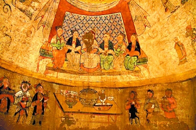 据专家介绍,被损的壁画可能是舞蹈图画,整个墓室壁画表现出墓主人一边欣赏着舞蹈、聆听着音乐,一边享受着侍女们提供的美食。