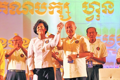 1月19日,在柬埔寨首都金边,柬埔寨亲王诺罗敦·拉那烈(前右)与奉辛比克党副主席阿龙拉斯美出席会议。当日,他正式出任奉辛比克党主席。
