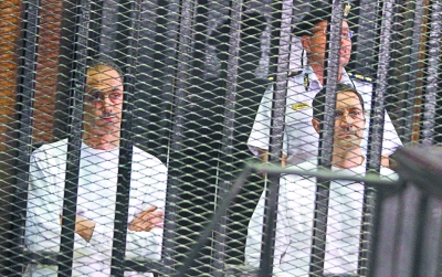 这张2012年7月9日拍摄的资料照片显示的是穆巴拉克的儿子贾迈勒(左)与阿拉在埃及首都开罗出席庭审。据埃及官方媒体中东社26日报道,埃及前总统穆巴拉克的两个儿子已于25日被释放,但穆巴拉克本人仍被拘押在开罗一所军队医院内。新华社发