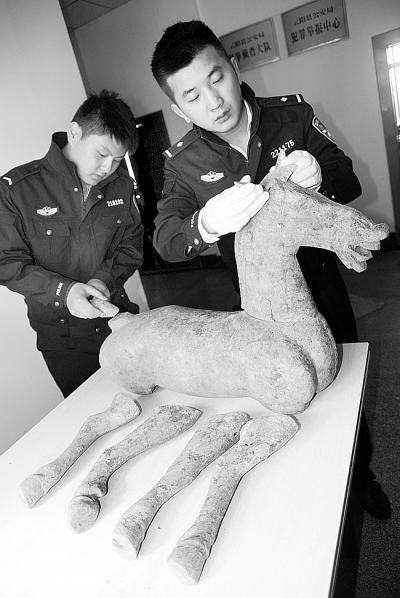 公安民警展示被盗卖的古墓殉葬文物青铜马(2014年10月31日摄)。  日前,重庆市云阳县人民法院公开审理一起盗卖三峡库区珍贵文物案,4名涉嫌盗掘古墓、贩卖古文物的被告人出庭受审。新华社发(饶国君摄)