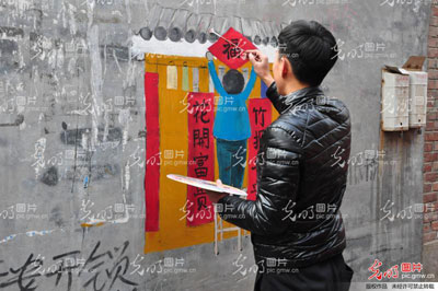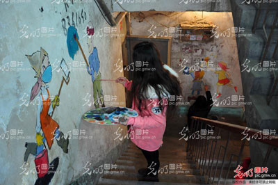 2015年2月1日,山东聊城大学美术学院大学生在楼道绘画,小广告变身壁画。山东聊城大学美术学院20名大学生用手中的画笔、颜料在社区楼道中绘画,向楼道里的小广告“宣战”,将楼道的“旧貌”换“新颜”,小广告变身为壁画,丰富居民的文化生活。许文豪摄/光明图片