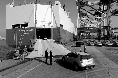 图为1月14日,山东青岛保税港区码头,海关关员在监管出口整车装运。 新华社发(俞方平摄)