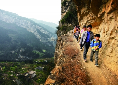 | 《绝壁求学路上的老师》 王伟倩 2012年,贵州省毕节市生机镇中心学校人事调动,37岁的徐良凡被调到了离家3公里外的半坡小学担任校长。通往学校的路是一条几十年前在悬崖峭壁上开出的修渠便道,村里大概有20名学生每天都要通过这条400米长、最宽处不到1.5米的绝壁小路去上学。考虑到学生们的上学安全,徐良凡每天都要护送学生安全走过悬崖路。每次外出采购学生营养午餐的材料,徐良凡都会背着装满大米和猪肉的背篓穿梭在悬崖路上。无论刮风下雨,他从来没有耽误过学生们的营养午餐供应。 |
