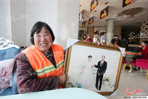 2月9日,河南省灵宝市60岁的环卫女工王春英展示自己的婚纱照。近日,灵宝市城管局和灵宝罗门婚纱摄影共同为100名优秀环卫工人送上了免费拍摄婚纱照或全家福的新年大礼。不少环卫工人坦言,这是自己第一次拍婚纱照。赵华摄/光明图片