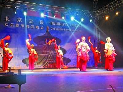 表演中国宫廷舞蹈的艺术家们通过柔美的身姿、华丽的宫廷服饰、完美的光影结合以及娴熟的舞技将现场还原到了大唐盛世的宫廷,彻底征服了现场观众。尤为值得一提的是,土耳其武术协会为庆祝“欢乐春节”活动,特别奉献了一个由土耳其人表演的武术节目。他们表演了太极拳、南拳、通臂拳等功夫套路,赢得潮水般的掌声。他们中有四人来自土耳其一个武术世家,其中三人都获得过国际武术比赛的冠军。由于十分倾慕中国功夫,他们分别取了穆桂英、花木兰、李小龙的名字。演出结束后,土耳其观众全场起立,报以持久的掌声。
