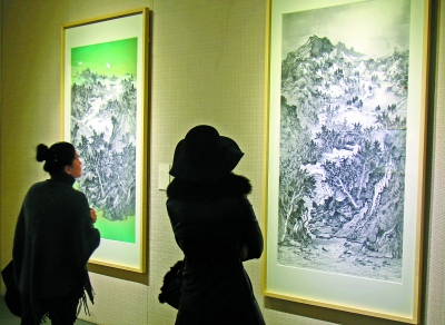 图为观众在欣赏展览作品。