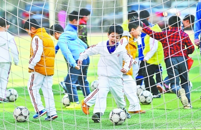 3月13日,北京市崇文小学举办2015年校园足球节,邀请原国家女足队队员与师生共同参加了足球操等活动。图为足球节上学生们在进行足球技术练习。本报记者 赵洪波摄