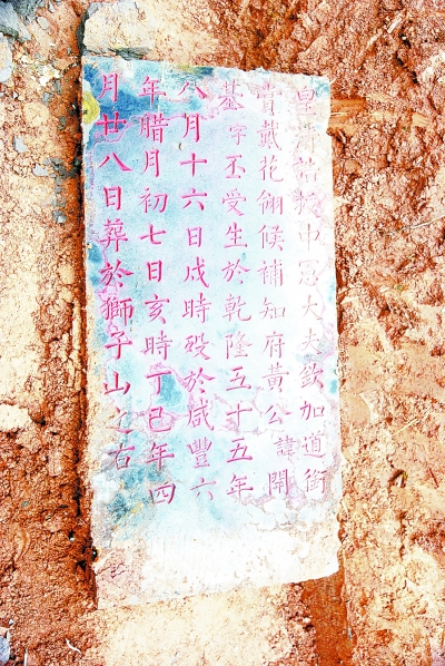 位于永川区五间镇盘龙桥的黄开基墓在20世纪70年代受到严重损毁,正碑荡然无存,仅留有封土堆和部分拜台墙基。近年来,修复黄开基墓被提上议事日程。经过前期准备,修复工作目前已经正式启动。3月16日,工作人员在原墓墙基础下发现了两块扣合在一起的内碑。内碑上块面书:“诰授中宪大夫,钦加道衔,赏戴花翎,黄公讳开基,字丕受大人之墓。”落款“皇清咸丰七年四月二十八日祀男,同知体元;国学惠元;监生保元;教谕续元、枢元”。内碑下块面书“皇清诰授中宪大夫钦加道衔、赏戴花翎,候补知府,黄公讳开基,字丕受,生于乾隆五十五年八月十六日戌时。殁于咸丰六年腊月初七日亥时,丁已年四月二十八日葬于狮子山之右。”内碑字体工整,均为阴刻楷书,并涂以朱砂,虽深埋土中百余年,当日挖出时,朱砂仍鲜红如新。