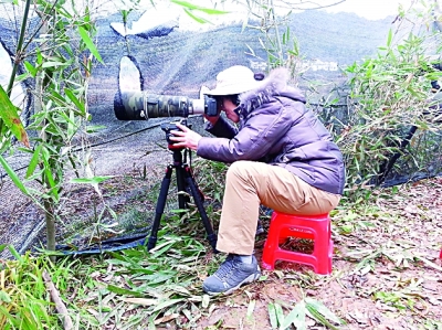 接下来的三天,我们在苦苦寻找白颈长尾雉的身影。第一天,天蒙蒙亮,我们就在伪装棚里,仔细查看对面山坡上白颈长尾雉曾经出现的地方。太阳透过竹林洒下万丈金光,周围一点动静也没有,直到老法师在台阶上轻喊“吃饭了”,白颈长尾雉也没出现。