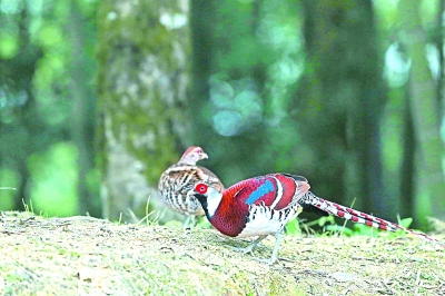 不过五分钟,这只雄性白颈长尾雉又出来了,身后跟着一只全身带棕色条纹的雉鸡,小脑袋大眼睛,左转右看。“是雌鸡!”有人低声说。棚子里又响起一阵连拍的快门声。只见雄性雉鸡时而高昂头颈大步走,时而低头快速啄食,雌性雉鸡紧随其后,常常是一只觅食,另一只抬头观望。几分钟后,这一对急急忙忙走到山下。“它们还没吃完,还有一对呢!”不知什么时候老法师站在身后低声说。果不出所料,十几分钟后,翅膀上支着一根白羽的雄性雉鸡从正前方急匆匆地走过来,顾不得抬头,那样子似乎饿极了。旁边的大树后又探出一只雌性雉鸡,这一对有意思,从两边觅食,向对方靠拢,会合后,又交错觅食,再回转身靠近,始终很警觉。我们在棚子里除了快门的响声不敢有一点动静,生怕惊扰了“白仙子”五天来难得的一顿饱餐。