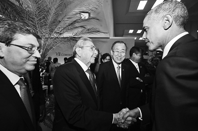 美国媒体报道说,根据“事先计划”,奥巴马与劳尔·卡斯特罗在出席巴拿马总统巴雷拉主持的第七届美洲国家峰会开幕式前夕握手致意,并互相问候。这是古巴首次受邀参加这一地区性峰会,也是自1961年美古中断外交关系之后,两国元首第一次共同出席正式会议。尽管白宫国安会发言人米汉向媒体表示,二人的握手属于“非正式互动”,没有进行“实质性”对话,但大多数媒体认为,此次握手寒暄在美古关系上具有历史意义。《华尔街日报》报道称,美古领导人按照设计在周六晚上举行了50多年来的首次会晤,这一“里程碑式的会晤”标志着两国正努力恢复全面外交关系。奥巴马与劳尔·卡斯特罗在美洲峰会的座位安排(中间相隔两人)体现了奥巴马努力重塑与这个长期敌对国家的双边关系,也象征着奥巴马在其第二任期以来继续推行的外交政策大转变。一直帮助安排美古秘密会谈的白宫国安会副顾问本·罗兹说:“这不仅仅是两国领导人坐在一起,更是美国与古巴接触正发生‘根本性’变化。”