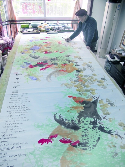 “我这个年龄就是画巨画的时候。”走进位于五通桥的陈玉书家中,这位当地人称“陈鸡公”的老画家中气十足地告诉我们。今年已经75岁的陈玉书精神矍铄,他14岁开始作画,笔墨耕耘一甲子,尤擅芦雁和公鸡。“快刀手,复印机。”老伴钟素清这样形容自己的丈夫,“一件巨幅半天就画好。”20多年前,夫妻俩在路边开了家餐馆,“陈鸡公”每天一手炒鸡,一手画鸡。如今虽然餐馆不开了,在家颐养天年的他,依然满怀豪情,当场为我们创作了一件巨幅中国画。