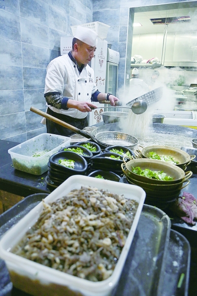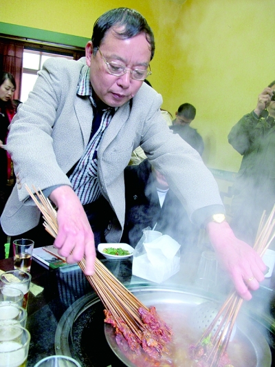 跷脚牛肉发源于乐山苏稽镇,制作时需要用牛大骨熬制老汤,并加入几十味滋补中药材,每天熬制10多个小时,不仅美味爽口,还具有开胃驱寒补肾的药膳功能。这里的跷脚牛肉均选用水牛杂,具有汤色碧清、香味绵长、牛杂脆嫩、吃法多样四大特色。