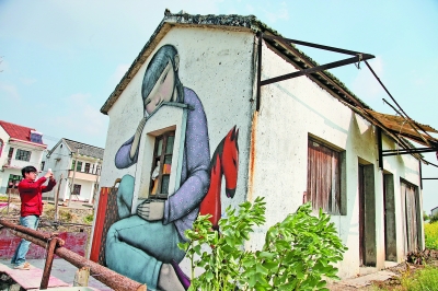 4月13日,在上海市金山区枫泾古镇新义村,游客拍摄法国艺术家马兰创作的“江南版”涂鸦作品。当日,法国艺术家马兰的4幅“江南版”涂鸦作品亮相上海市金山区枫泾古镇。新华社发(庄毅摄)