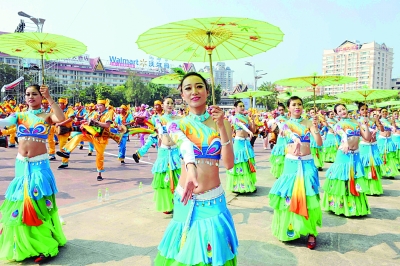 4月14日,云南省西双版纳傣族自治州庆祝傣历1377年新年“首届象脚鼓舞及民族文化大展演”在景洪市主要街道及泼水广场举行,来自全州40支民族表演队的5000余名各族群众,用独具特色的民间舞蹈,向观众和游客展示西双版纳丰富多彩的民族风貌和民间文化艺术。新华社记者 杨宗友摄