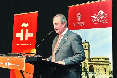 4月15日,在西班牙马德里,西班牙埃尔托沃索市市长马尔西亚诺·奥特加在《堂吉诃德》纪念手抄本发布会上讲话。2015年是西班牙作家塞万提斯的小说《堂吉诃德》第二部发表400周年。西班牙塞万提斯学院15日在马德里举行发布会,发布用包括中文在内的74种语言手写完成的《堂吉诃德》第二部的手抄本。 新华社记者 谢海宁摄