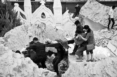图为人们从一处废墟中抬出一具遇难者遗体。 新华社发