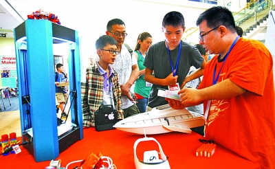 在第二届金桥小创客嘉年华上,工作人员在为观众讲解3D打印制作船模的方法。 新华社记者 方喆摄