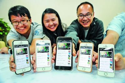 新媒体“贵州微联盟”的创始人(右一)与同事一起展示推送的公众号信息。 新华社记者 欧东衢摄