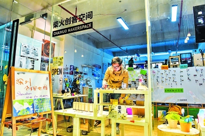 一名创客在深圳市南山区的“柴火创客空间”观看各种创客产品。 新华社记者 毛思倩摄
