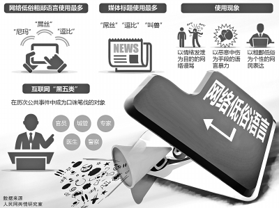 《网络低俗语言调查报告》日前发布,网络低俗语言使用现象包括网络谩骂、恶意中伤、粗鄙低俗等三类。在现实生活中,这些网络低俗语言也时常酿成悲剧——