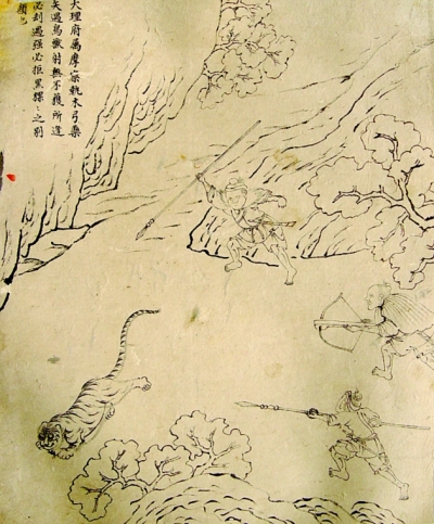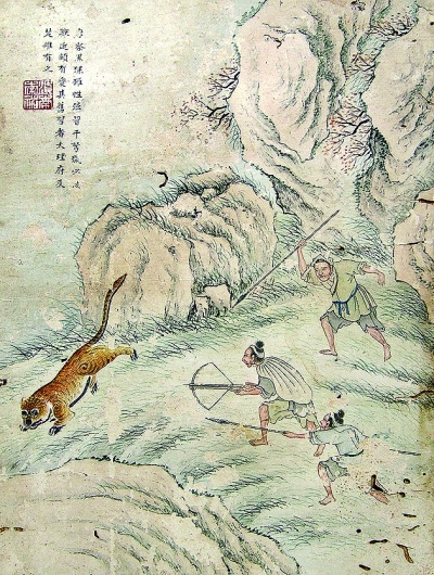 2001年春,昆明古玩界朋友说替我找到两幅清代描绘云南少数民族的图画,这是我三个月前请他们替我搜寻的结果。一眼看去,惊喜若狂:那熟悉的构图,那熟悉的画面,又远比我想象中的精彩!这就是学界认为早已散逸无存的《云南种人图说》中的两帧,画面绘制精美,题记字迹工整,且钤盖篆体白文“滇南李祜”印一方。这两帧画进一步证实了我手上那一百零九帧白描稿确实是《云南种人图说》正式绘制前的白描定稿本。