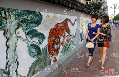 近日,一道长300多米的“国画文化墙”亮相江苏苏州工业园区金鸡湖路。一幅幅由苏州大学生精心绘制的“中国画”成了姑苏街头一道亮丽的风景线。王建康摄/光明图片