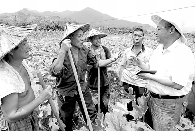6月11日,闽清县委常委、纪委书记郭有旭(右一)在坂东镇坂中村向蔬菜种植大户刘久棋(左一)了解种植情况,帮助解决蔬菜销路问题。 福建省闽清县在开展“三严三实”专题教育中,从引导党员干部加强党性、改进作风、求真务实入手,通过“包挂联结”的办法,要求全县处级以上干部每人包一个重点项目、挂钩一个乡镇、联系一个村居、结对5个困难群众,把践行“三严三实”真正落到实处。 新华社记者 张国俊摄