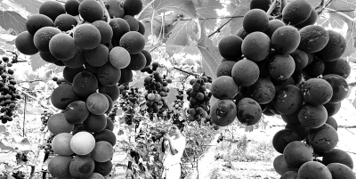 游客在观赏北京密云县天葡庄园内硕果累累的葡萄(7月7日摄)。近年来,北京市在所辖农业区县开展“调结构 转方式”的农业产业化发展,促进都市型现代农业向低碳、循环、可持续方向转变,形成了一批观光休闲、有机水果蔬菜、高端会展农业、农业科研、乡村旅游和林下特色经济的农业产业带。仅2014年,北京市各级农业产业化龙头企业完成销售收入4100亿元,休闲农业和乡村旅游全年接待游客3825万人次。新华社记者 李欣摄