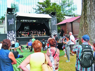 图为来自美国得克萨斯州某高中的爵士乐队在蒙特勒市中心的公园里,为公众进行免费表演。本报记者 何农摄