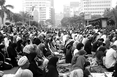 当地时间17日凌晨5点左右,数万名埃及民众聚集在开罗市中心穆斯塔法·穆罕默德清真寺门前的广场上,以清晨第一个礼拜迎接开斋节的到来。开斋节是莱麦丹(斋月)结束后的第一天。按照习俗,穆斯林在做完早祷告之后就可以吃一些东西,象征斋月的结束。本报记者 于杰飞摄