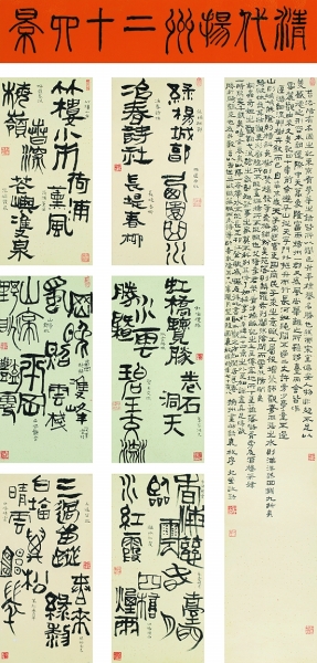 在创作过程中,顾风调动自身的能力和艺术储备,首先在作品形式的设计上做了些尝试,除保留一部分常规的四尺、六尺条幅、斗方等形式之外,还根据内容设计了一些多屏组合、双屏合裱、多片合裱的形式,这样的设计往往还要综合考虑到纸张的色彩、质地,书体的变化以及书写形式的变化。