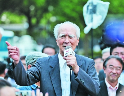 7月23日,在日本东京,日本前首相村山富市(中)发表演讲。当日,91岁的日本前首相村山富市在众议院第二议员会馆前举行街头演讲,反对日本政府强行推进安保法案和日本首相安倍晋三的“暴走”政治。他演讲时还有数百人在该会馆前举行反对安保法案的抗议活动。