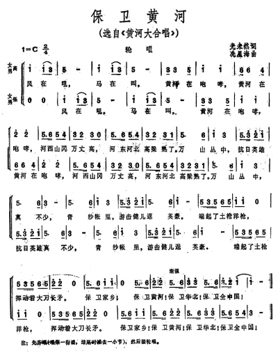 在《黄河大合唱》八个乐章中,作为单首歌曲流传最广的就是《保卫黄河》。也许,作为一般的演唱歌曲,《黄河船夫曲》太单调,《黄水谣》太压抑,而《怒吼吧!黄河》又太复杂。唯独《保卫黄河》既表达了战胜敌人、夺取胜利的激情,又便于演唱,在明快、充满信心的旋律中让人获得美的享受,体验到一种必胜的乐观主义情怀。