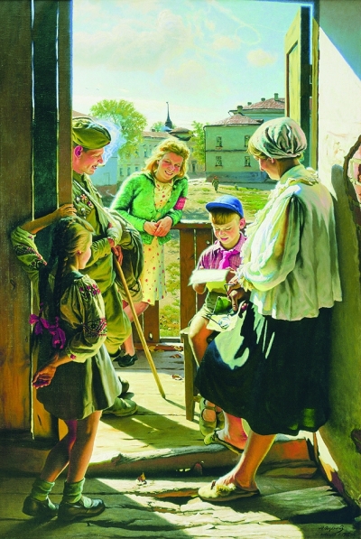 此次展览分为“战争与抵抗”“胜利的日子”“峥嵘的岁月”“传奇与功勋”“缅怀与追忆”“永恒的记忆”六个篇章。展览不仅有以写实主义手法表现的反法西斯题材作品,也有不少以浪漫主义、表现主义的方式进行创作表达的作品。大批中国观众耳熟能详的艺术作品荟萃其中,如拉克季昂诺夫在1962年创作的《前线的来信》,就曾收录在中国的历史课本当中。这幅作品描绘了战争期间,后方人民急切期盼着战斗在前方的亲人来信的场景。