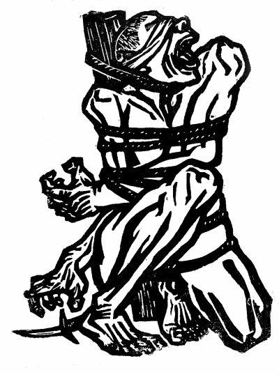 在抗战木刻作品里,我们更多读到的是对日军暴行的揭露——张在民的《日军暴行之一》、李桦的《辱与仇》、林仰峥的《码头》、丰中铁的《谁无姐妹,谁无妻子》、王树艺的《无家可归》、汪刃锋的《人民的受难》和李平凡的《饥民》等作品,就是其时对日寇肆无忌惮地屠戮奸杀中国同胞、造成数以千万计的难民无以安家的真实描写与血泪控诉。这些方寸间的黑白图像,既是日军屠杀中国人民的历史见证,也是唤醒民众奋起抗争的火种。于是,我们读到了胡一川的《到前线去》、沃渣的《抗战总动员》等鼓舞人们奋进、激励人们去战斗的作品。