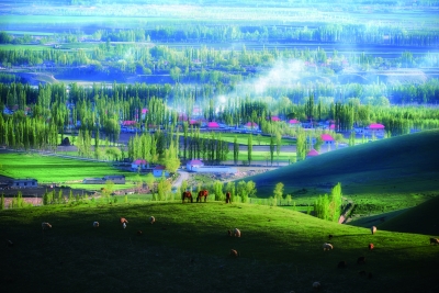不到新疆不知中国之大,不到伊犁不知新疆之美。这片被誉为“塞外江南”的绿洲之地吸引了数不清的艺术家,也孕育了无数艺术精品。摄影者没有简单选择纯粹的风光抑或人文视角,而是把包括人类在内的,在这片土地上存在的生灵平等看待。他将河流、村庄、林木、羊马等物像定格在同一幅画面中,远近铺陈、和谐共处。照片中的勃勃生机从动物、植物以及房顶冒出的炊烟表现出来,使得整幅作品就像一个活力四射的艺术生命体。