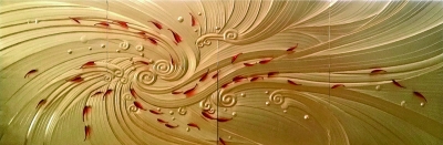 而我们为中国人寿北京分公司营业厅设计的刻漆壁画,则是运用传统工艺技法集中表现了北京的古都新貌,具有浓郁的地域文化特点。营业厅接待区域的春夏秋冬漆浮雕和不锈钢山形圆雕的组合,也突破了传统的挂画套路,使人耳目一新。