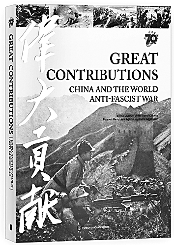由中国人民抗日战争纪念馆馆长沈强主编,中国人民抗日战争纪念馆编的《伟大贡献——中国与世界反法西斯战争》一书,取材于2014年9月3日由中国人民抗日战争纪念馆举办的大型同名展览。该书精装版7个语种由外文出版社于2015年8月底出版,从策划、组稿、编辑、专家审读、反复核对、校正到出版成书历时一年,史料丰富,图文并茂,被中宣部遴选为“纪念中国人民抗日战争暨世界反法西斯战争胜利70周年重点出版物”之一。
